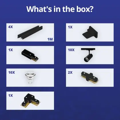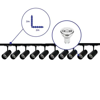 Beschrijving Complete Set 1-Fase Rail L 2 x 2 Meter Zwart | incl. 10x Spot + GU10 2700K 3W Dimbaar + Eindkap, Voedingsconnector en L -Verbindingsstuk