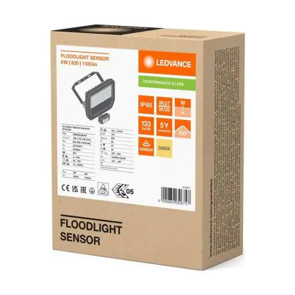 Beschrijving Ledvance LED Breedstraler Aluminium Zwart 8W 1100lm 100D - 830 Warm Wit | IP65 - Bewegings- En Lichtsensor - Symmetrisch