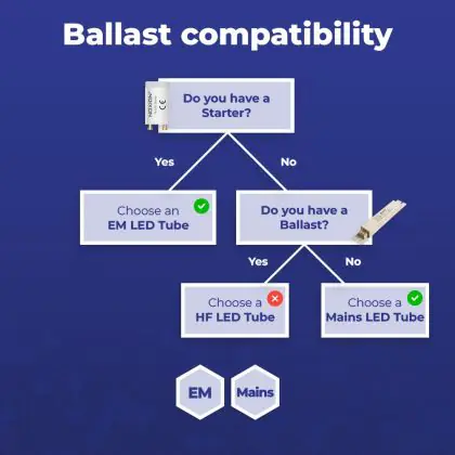 T8 (TL-D) TL buizen werken met behulp van een conventioneel voorschakelapparaat met starter of een elektronisch voorschakelapparaat (VSA). Stap je over op LED dan is belangrijk dat je een LED TL buis kiest, die gebruik maakt van hetzelfde VSA. Is dit een conventioneel VSA, dan is de vervangende LED starter bij de lichtbron inbegrepen. Deze specifieke LED buis werkt met een .
